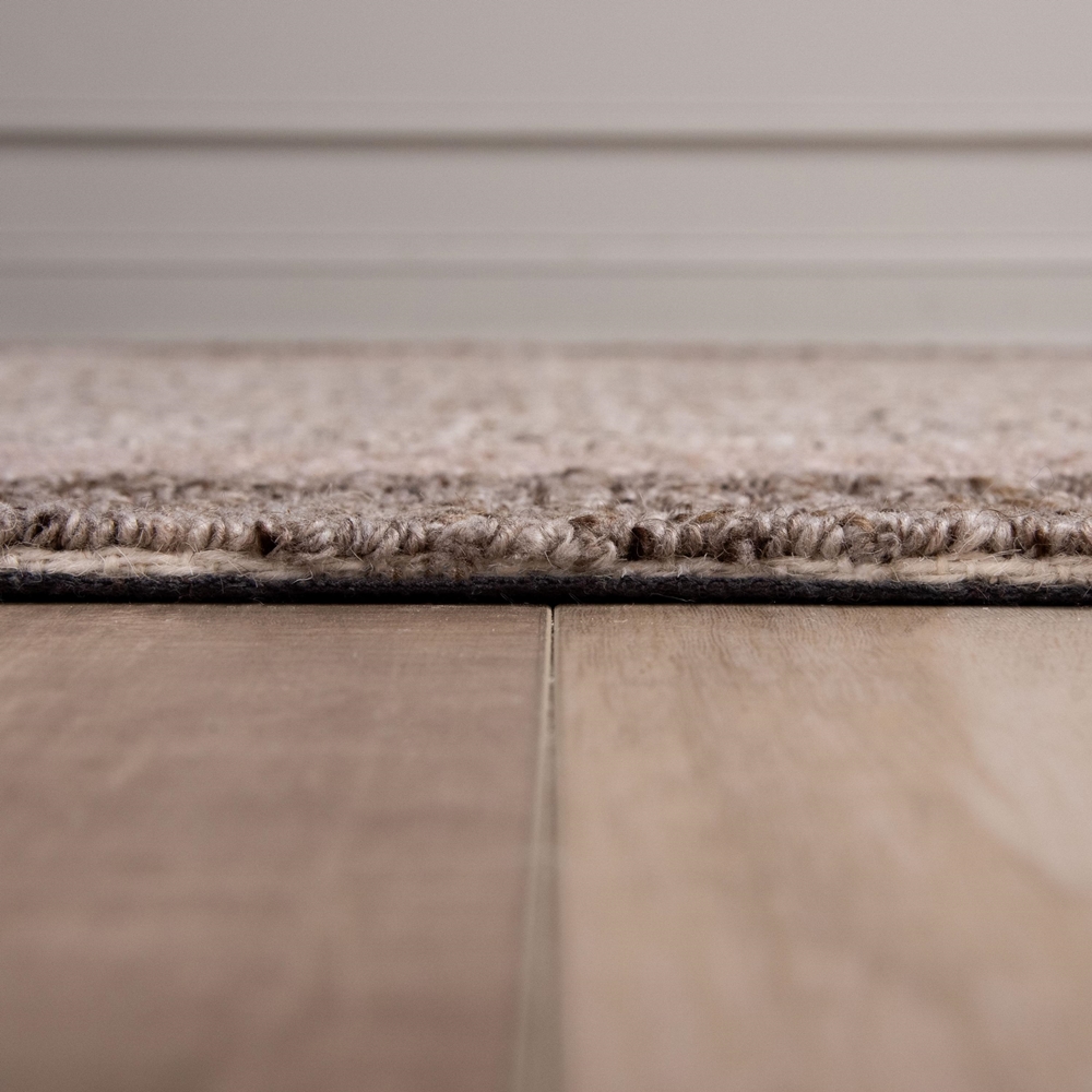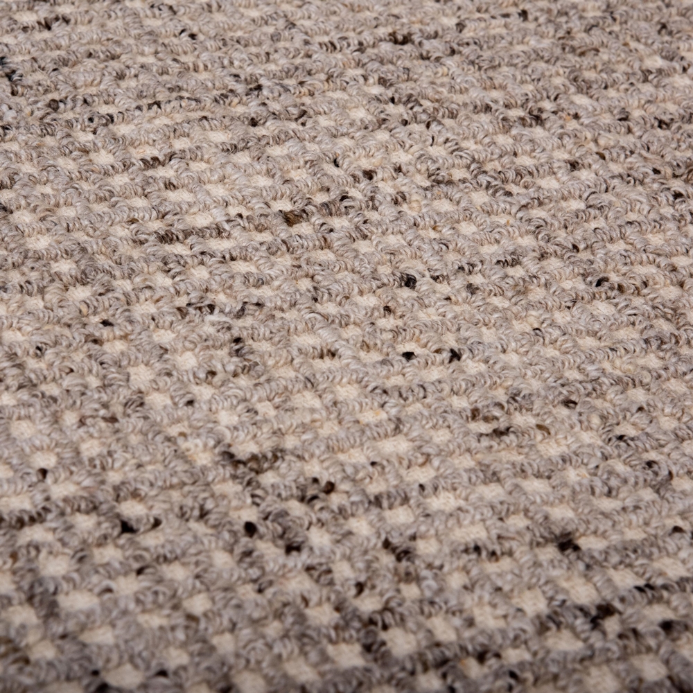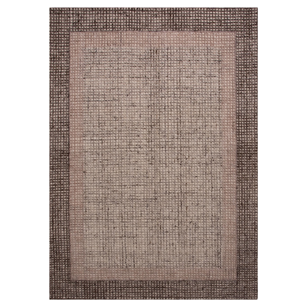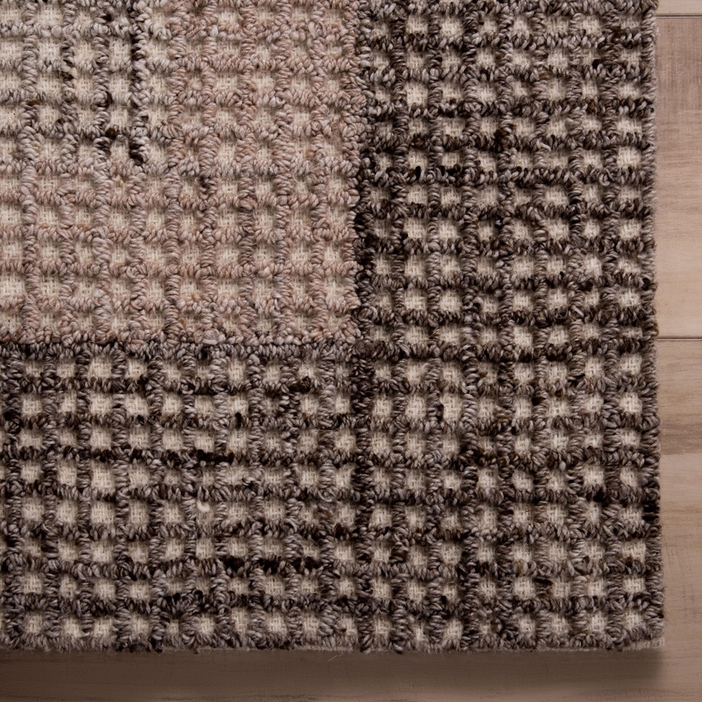 The Slate Collection rug by Rizzy Home combines timeless craftsmanship with modern sophistication. Hand-tufted from 100% wool, this rug features a finely detailed pattern of petite, textured loops that create a subtle checkered effect. The intricate design alternates soft beige tones with rich browns, giving the area rug a dynamic two-tone depth that feels both dimensional and understated. Framed by a contrasting border, its full loop pile and hand-serged edges provide a polished finish. Perfect for modern and transitional spaces, this rug’s versatile style makes it an elegant foundation for any room
